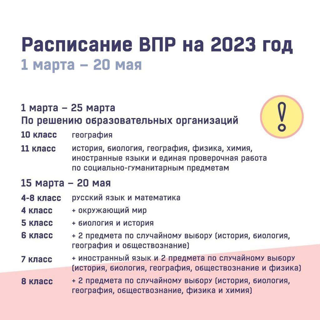 31.01.2023В этом году всероссийские проверочные работы пройдут в период с 1 марта по 20 мая. Конкретные даты проведения для каждого класса и предмета школы устанавливают самостоятельно.