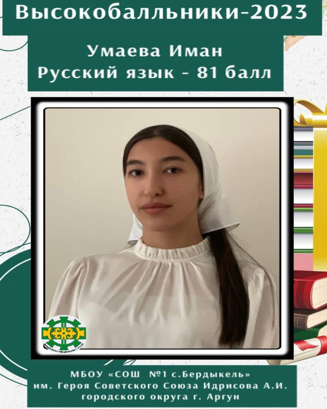 22.06.2023Выпускница МБОУ «СОШ №1 с. Бердыкель» им. Героя Советского Союза Идрисова А.И. городского округа г. Аргун – Умаева Иман, набрала 81 балл по русскому языку."Хочу выразить огромную благодарность моей учительнице по русскому языку и литературе - Таисе Шамуновне - она же моя мама! Благодаря ей я получила знания, которые пригодились мне в жизни.Хочу поблагодарить также своего классного руководителя Эльзу Султановну Исраилову за её поддержку и интерес к моим делам.Хочу пожелать будущим выпускникам: идите к намеченной цели упорно, никогда не сдавайтесь и трудитесь для достижения желаемого результата", - прокомментировала свой успех Иман.Дала т1аьхье беркате йойла!