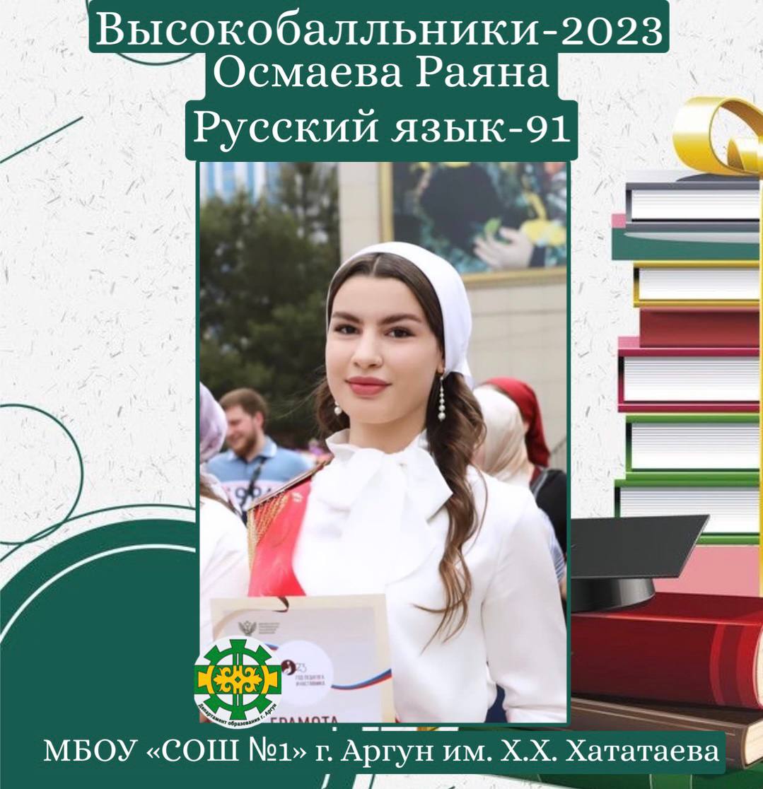 22.06.2023Выпускница МБОУ «СОШ №1» г. Аргун им. Х.Х. Хататаева – Осмаева Раяна набрала 91 балл по русскому языку.«Учителем быть - это призвание и нелегкий труд.Хотелось бы поблагодарить свою учительницу русского языка и литературы, которая также является моей классной руководительницей - Абубакарову Фатиму Вахаевну. Я очень благодарна вам за те знания, которые вы мне давали на протяжении всего этого времени, и спасибо вам, что всегда верили в меня.Не хватит слов благодарности, чтобы выразить всю признательность вам, как учителю с большой буквы!Выражаю благодарность директору нашей школы Сулеймановой Жамиле Хамзатовне и всему педагогическому составу», - прокомментировала Раяна.Дала т1аьхье беркате йойла!