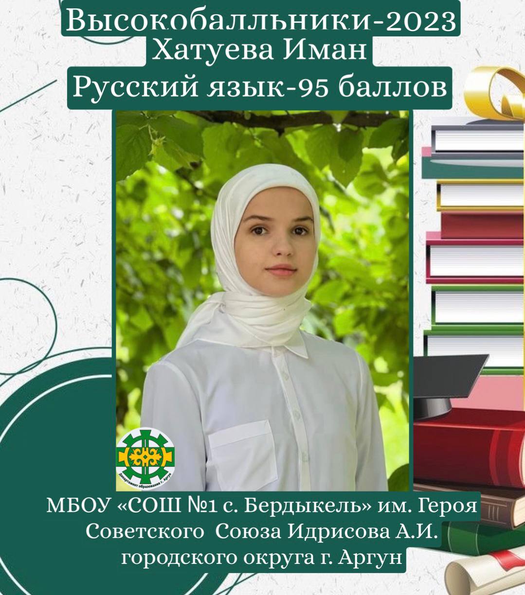 22.06.2023Выпускница МБОУ «СОШ №1 с. Бердыкель» им. Героя Советского Союза Идрисова А.И. городского округа г. Аргун – Хатуева Иман набрала 95 баллов по русскому языку.«Подготовка к ЕГЭ - увлекательный процесс, который требует затрат времени и энергии, поскольку ученик сталкивается с большим объемом информации. Важной частью этого процесса являются профессиональный учитель, поддержка родных и близких. Для успешной сдачи ученику необходимо поставить цель, разработать план подготовки, следовать ему, чтобы знания сохранялись в памяти в определенном порядке. Во время подготовки я читала справочники по подготовке к ЕГЭ, использовала интернет-ресурсы и подкрепляла знания, выполняя задания по пройденным темам. Зачастую приходилось проводить целые дни за учебниками. В момент сдачи ЕГЭ я не волновалась, поскольку понимала, что все в руках Всевышнего.Достижение такого результата не представлялось бы возможным, если бы на протяжении всего пути меня не сопровождала учительница русского языка и литературы - Салтыханова Таиса Шамуновна. Благодаря её умению систематизированно преподносить материал, любви к своему делу наша школа достигла высоких результатов.Хотелось бы искренне пожелать удачи будущим выпускникам и напомнить, что все зависит от ваших усилий. Во время подготовки могут возникать трудности, но вы не должны сомневаться в своих возможностях, знаниях. Ваша задача-целеустремленно работать, чтобы добиться желаемого результата», - прокомментировала свой успех Иман.Дала т1аьхье беркате йойла!
