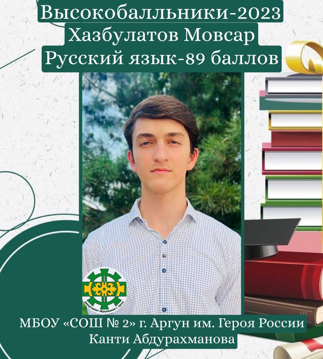03.07.2023Выпускник МБОУ «СОШ № 2» г. Аргуна им. Героя России Канти Абдурахманова - Хазбулатов Мовсар Аюб-Ханович набрал 89 баллов по русскому языку.