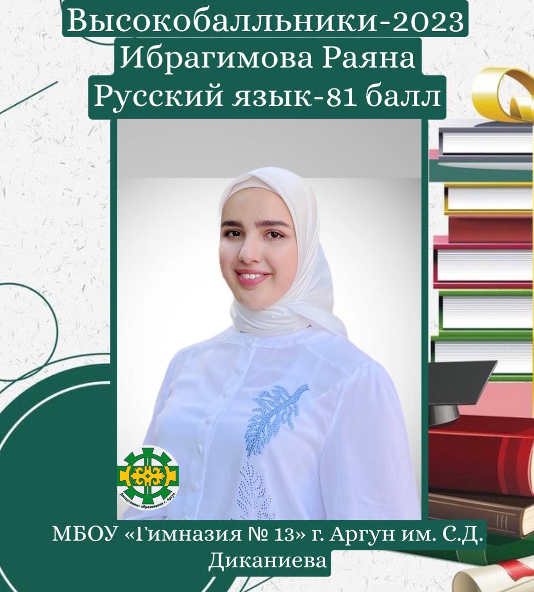 03.07.2023Выпускница МБОУ «Гимназия №13» г.Аргуна имени С.Д. Диканиева Ибрагимова Раяна Абдиевна набрала 81 балл на ЕГЭ по русскому языку.