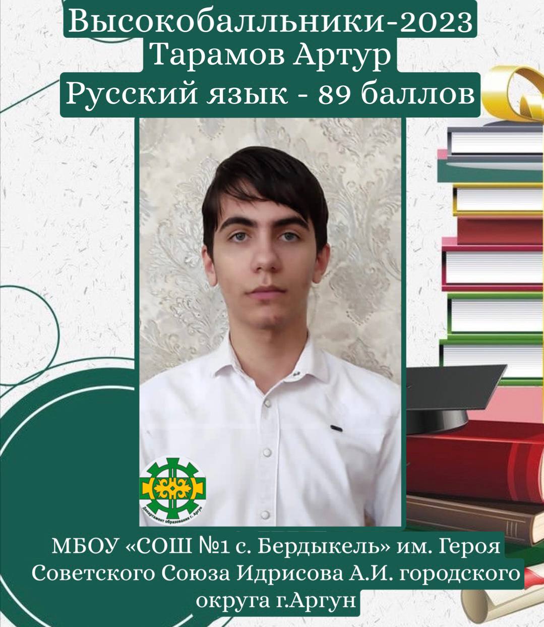 03.07.2023Выпускник МБОУ «СОШ №1 с. Бердыкель» им. Героя Советского Союза Идрисова А.И. городского округа г. Аргун – Тарамов Артур Вахитаевич набрал 89 баллов по русскому языку.