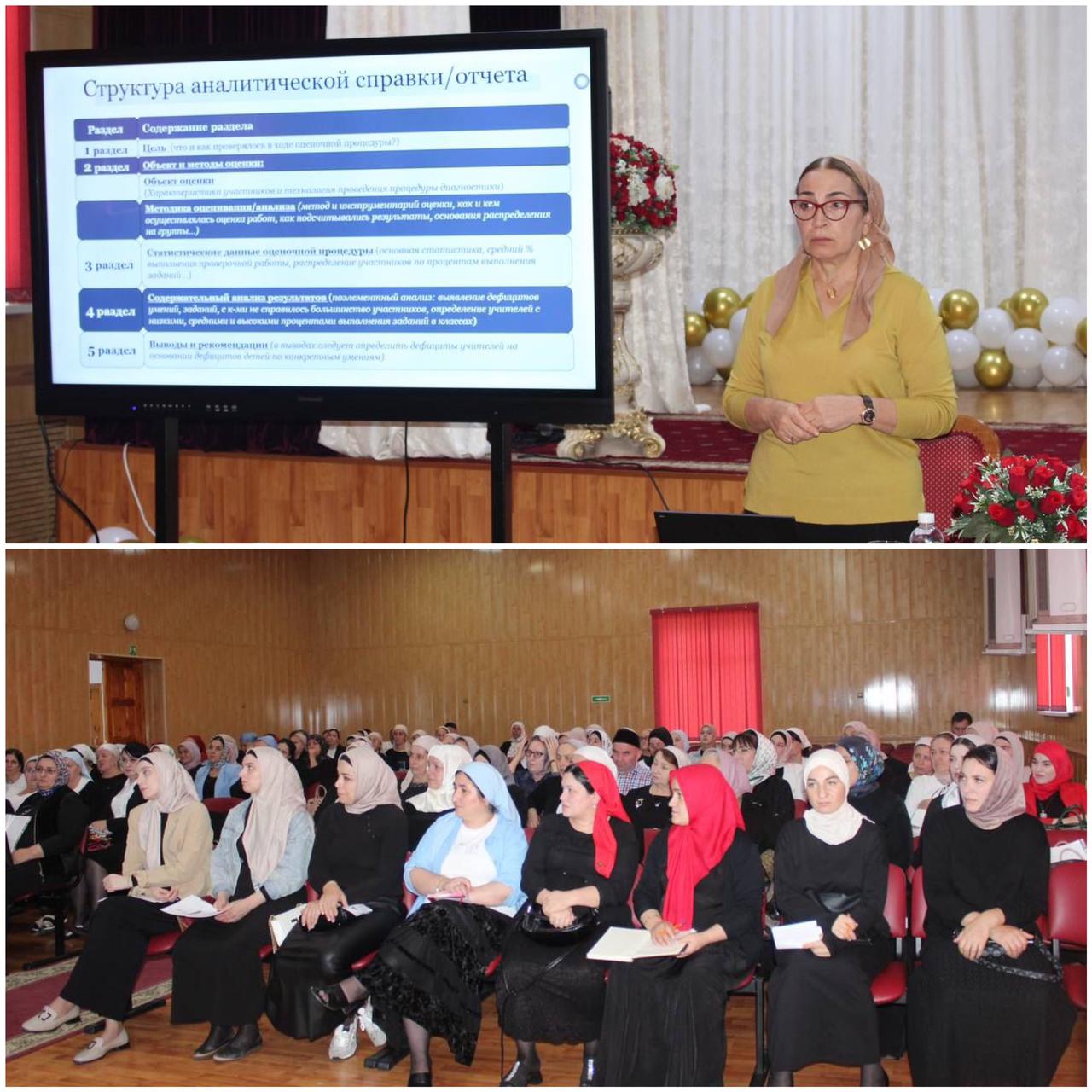 10.10.2023В рамках реализации плана мероприятий по проведению Года педагога и наставника в ЧР, на основании приказа Министерства образования и науки ЧР №1131-п от 28.08.2023 г. «О реализации регионального проекта «ПРОдвижение» для обучающихся 4-х классов общеобразовательных организаций ЧР» в целях методического сопровождения реализации проекта ГБУ ДПО «ИРО ЧР» на базе МБОУ «СОШ № 1» г. Аргун им. Х.Х. Хататаева провели практический семинар.На встрече присутствовали ректор ИРО ЧР Эльмурзаева Ганга, муниципальные координаторы проекта, учителя 4-х классов, заместители руководителей по учебной работе городского округа город Аргун, Шалинского и Веденского районов.Ганга Бекхановна разъяснила особенности проблемного анализа результатов Всероссийских проверочных работ, а также отметила, что в дальнейшем будет проводиться коррекционная работа с учетом выявленных дефицитов с учащимися 4- классов.
