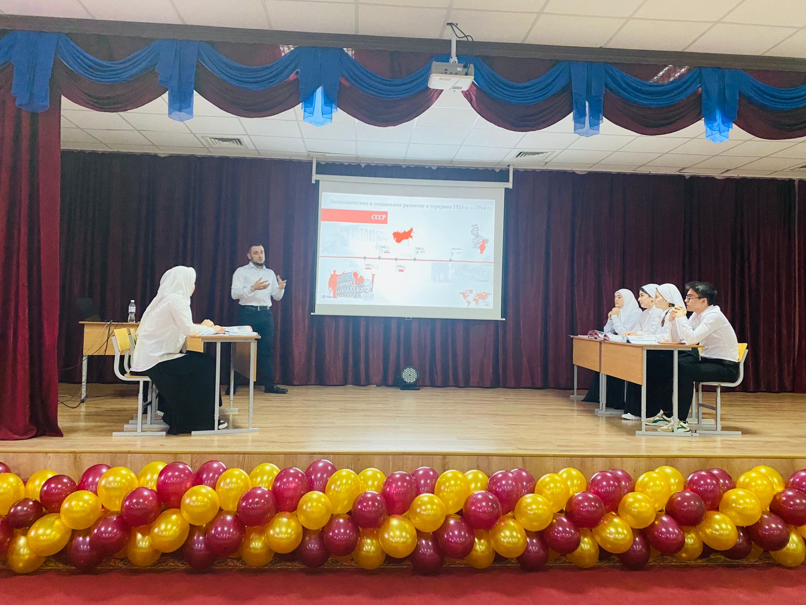 18.01.2024В рамках реализации методического проекта, который реализуется Министерством образования и науки ЧР совместно с ИРО Чеченской Республики в городском округе город Аргун на сцене актового зала МБОУ «СОШ № 2 с. Бердыкель» для учителей провели очередной «Урок на сцене».В этот раз состоялся урок по истории на тему «Экономическое и социальное развитие СССР 1950-1960 гг.» для 11 класса. Занятие провел учитель истории и обществознания МБОУ «СОШ № 2 с. Бердыкель» и региональный методист Исаев Денильбек Казбекович.В данном мероприятии приняли участие специалисты Департамента образования г. Аргун, учителя истории и обществознания, руководители общеобразовательных организаций и их заместители, а также региональные методисты округа.По завершении урока Денильбек Казбекович провел детальный самоанализ урока, рассказал, какой вид деятельности к какому результату относится и с помощью каких приёмов и технологий смог их реализовать. А также были выслушаны и обсуждены рекомендации и замечания присутствующих.