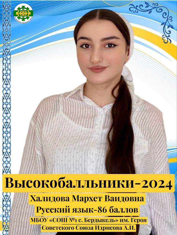 Выпускница МБОУ «СОШ № 1 с. Бердыкель» им. Героя Советского Союза Идрисова А.И., Халидова Мархет Ваидовна набрала 86 баллов на ЕГЭ по русскому языку.