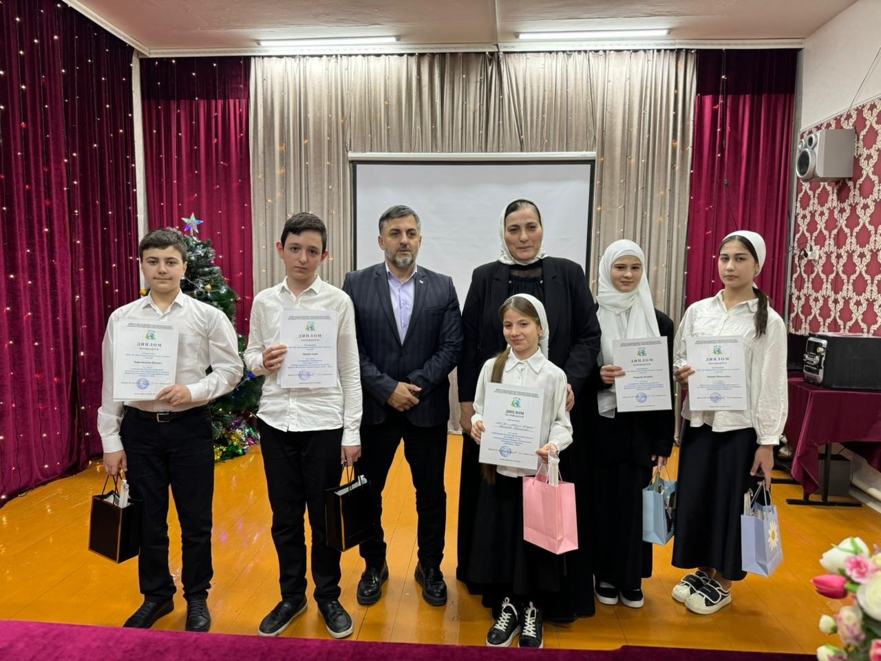 Дипломами и памятными подарками от Департамента образования были награждены следующие победители и призеры конкурсов: 1 место - Налаев Ахмед, 1 место - Дакаев Адам, 1 место - Папаева Ясмина, 1 и 2 место - Бирсункаев Исмаил, 1 место - Мусраилова Марьям, 3 место - Демишева Сафият, 1 место - Баштагова Айза.