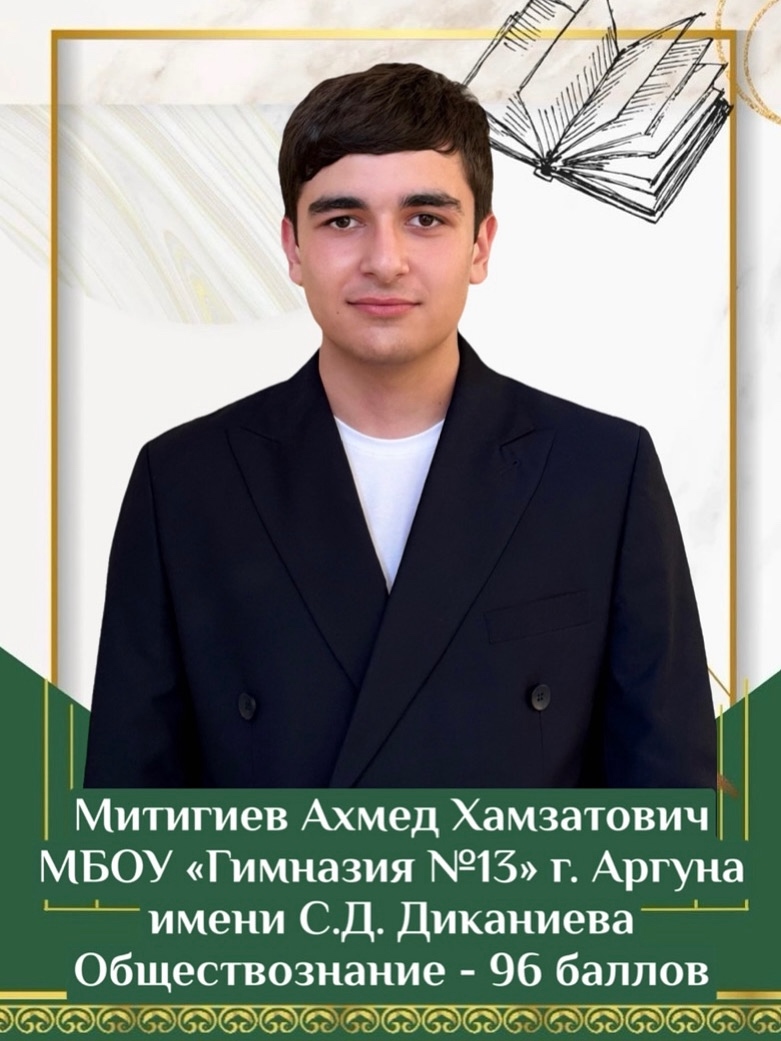 22.07.2025Выпускник МБОУ «Гимназия №13» г. Аргуна имени С.Д. Диканиева, Митигиев Ахмед Хамзатович набрал на ЕГЭ по обществознанию 96 баллов.
