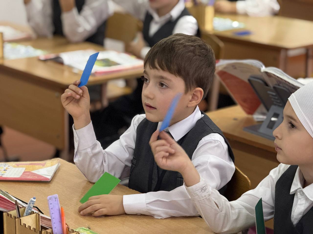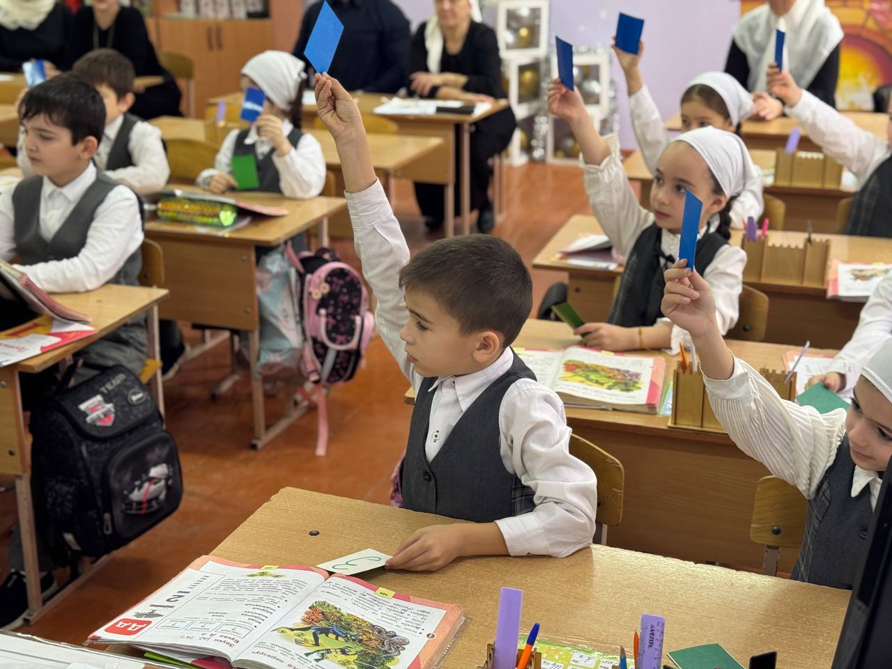 В МБОУ «СОШ №1 с. Бердыкель» в 1 «А» классе прошёл открытый урок по Азбуке. Первоклассники познакомились со строчной и заглавной буквами Д, д, а также разобрали согласные звуки [д] и [д‘]. На уроке дети учились различать звуки, читать слоги и слова, закрепляя новые знания через практические задания.