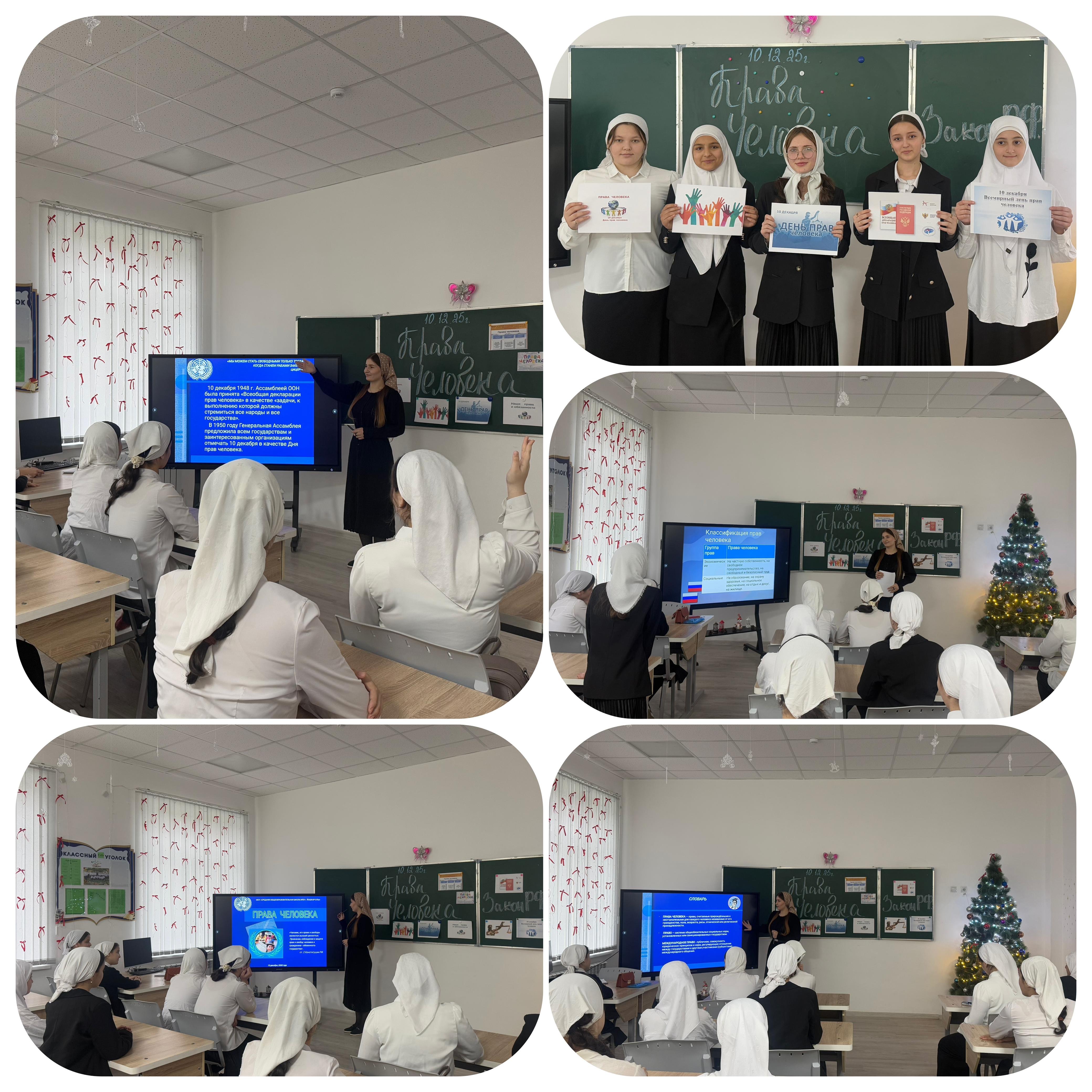 10 декабря в МБОУ «СОШ №1 с. Чечен-Аул» Чучаевой М. был проведён тематический урок, посвящённый Международному дню прав человека. В мероприятии приняли участие обучающиеся 7-х классов.